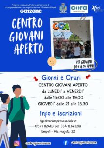 CENTRO GIOVANI APERTO – Da lunedì a venerdì dalle 15 alle 19 e giovedì dalle 21 alle 23.30. per informazioni e iscrizioni: cga@coraimpresasociale.it, 0571 82403, 3348343218.