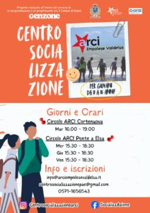 CENTRO SOCIALIZZAZIONE – Circolo Arci Cortenuova aperto il martedì dalle 16 alle 19; Circolo Arci Ponte a Elsa, mercoledì, giovedì e venerdì dalle 15.30 alle 18.30. Per informazioni e iscrizioni: info@arciempolesevaldelsa.it, centrosocializzazionepae@gmail.com , 0571 1656543.