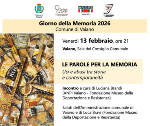 L’incontro, dal titolo “Le parole per la memoria. Usi e abusi tra storia e contemporaneità”, si svolgerà alle ore 21 nella Sala del Consiglio comunale di Vaiano. L’appuntamento sarà curato da Luciana Brandi, già docente universitaria di psicolinguistica, per Anpi Vaiano e la Fondazione Museo della Deportazione e Resistenza, e sarà introdotto da Luca Bravi.
