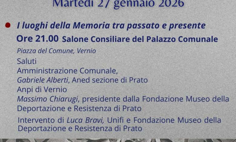 Vernio, 24 gennaio 2026 – La memoria è una pratica fondamentale da portare avanti per contestualizzare le difficoltà del presente e il Giorno della Memoria e uno degli strumenti per fare luce, attraverso il passato, sui preoccupanti passi indietro che l’Europa e il mondo stanno facendo. E’ con questo obiettivo che il Comune di Vernio, in collaborazione con la Fondazione Museo della Deportazione, ANPI e ANED la sera del 27 gennaio, alle 21, organizzano l’incontro “I luoghi della memoria fra passato e presente” con l’intervento di Luca Bravi (Fondazione Museo Deportazione e Unifi), autore insieme a Silvia Bencini (borsista di ricerca all’Università di Firenze) del volume “Auschwitz. Percorsi di memoria attiva. Luoghi e oggetti tra passato e presente”.