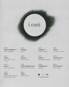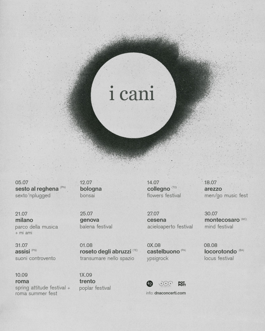 Dopo il successo del tour autunnale nei club (tutto sold out), i cani tornano in tour dal 5 luglio per una serie di concerti nei festival e nelle location più prestigiose dell’estate italiana.