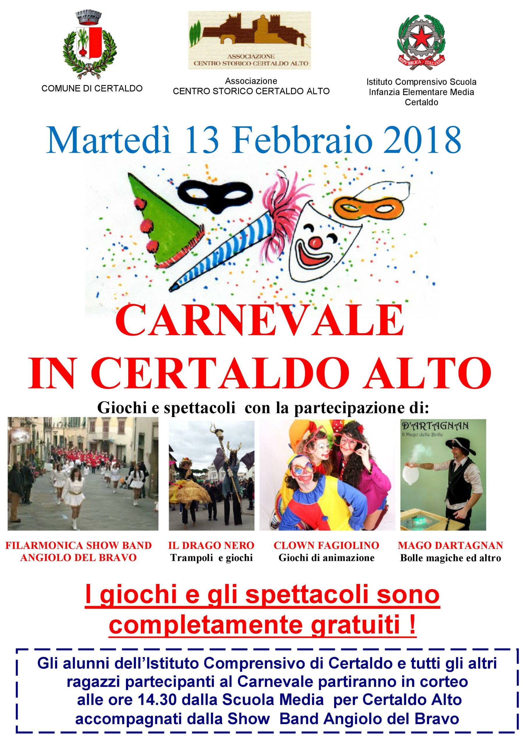 Martedì 13 Febbraio 2018, dalle ore 15.00 circa, il borgo medievale di Certaldo si riempie di maschere, coriandoli, stelle filanti, musica, giochi e colori con il tradizionale Carnevale organizzato dalla Associazione Centro Storico Certaldo Alto, in collaborazione con Istituto Comprensivo Scuola Infanzia Elementare Media Certaldo e Comune di Certaldo.