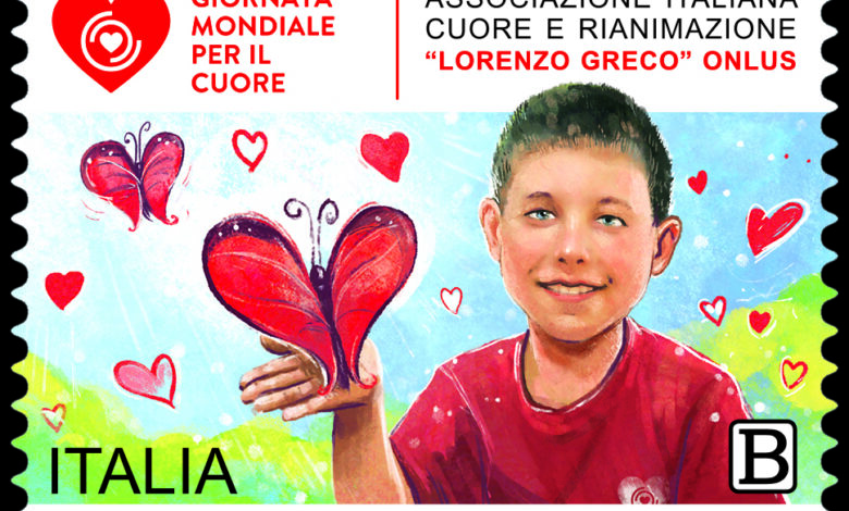 il materiale sull’emissione odierna di un francobollo appartenente alla serie tematica “i valori sociali” per la Giornata Mondiale per il Cuore dedicato a Lorenzo Greco.