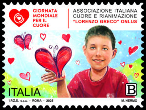 il materiale sull’emissione odierna di un francobollo appartenente alla serie tematica “i valori sociali” per la Giornata Mondiale per il Cuore dedicato a Lorenzo Greco.