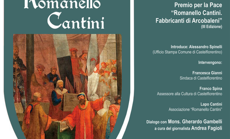 “La figura culturale e morale di Romanello Cantini – sottolinea l’Assessore alla Cultura, Franco Spina – con il lascito del suo pensiero e dei suoi scritti, rivive ancora a Castelfiorentino, con la 3° edizione del Premio a lui dedicato, quest’anno assegnato a Mons. Gambelli, operatore di Pace nel Ciad. Siamo felici di portare avanti, insieme all’associazione nata in suo nome, la Cultura della Pace, come testimonianza concreta a cui tendere nel quotidiano. La cultura della Pace parte dalle storie individuali, dal piccolo di ognuno di noi, dai “ponti” che edifichiamo tra le diversità, nel pieno rispetto della nostra e dell’altrui libertà. Perché iniziare a “fabbricare arcobaleni” può e deve essere il nostro compito nel mondo”.