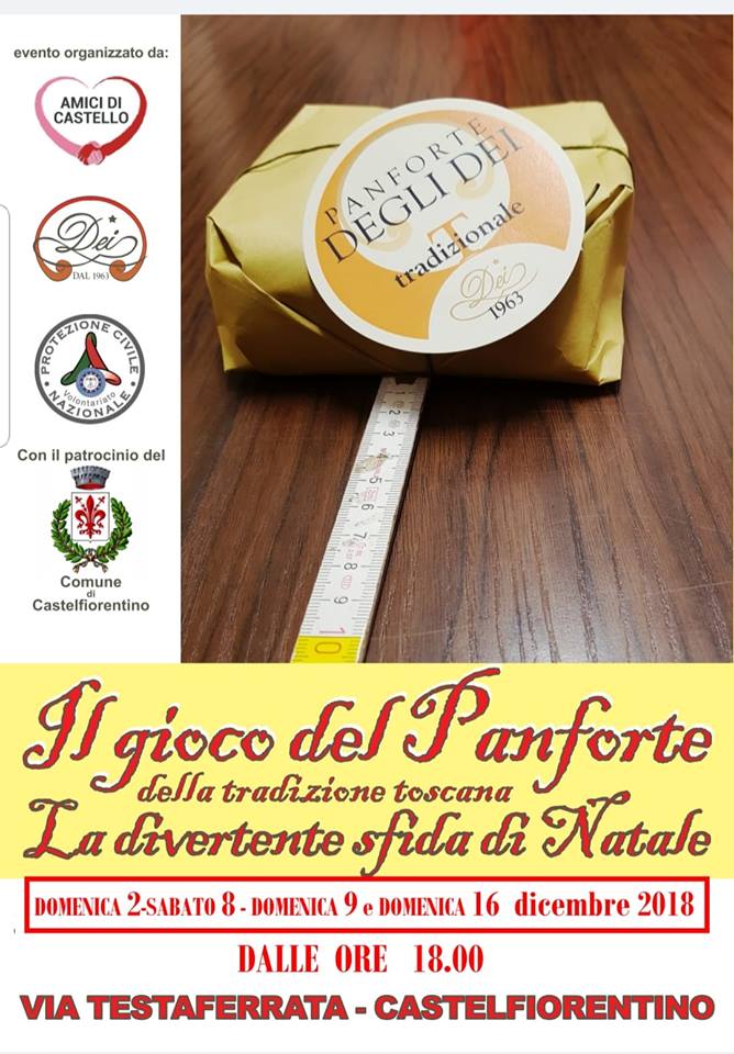 Nei pomeriggi di sabato 8 e domenica 9 dicembre, infine, alle ore 18.00, appuntamento in via Testaferrata con il “Gioco del panforte della tradizione toscana” (organizzato dall’associazione “Amici di Castello” da Pasticceria Dei e dalla Prociv Arci con il patrocinio del Comune di Castelfiorentino) e con “La Via dei Presepi” nelle vie e piazze del centro storico alto.