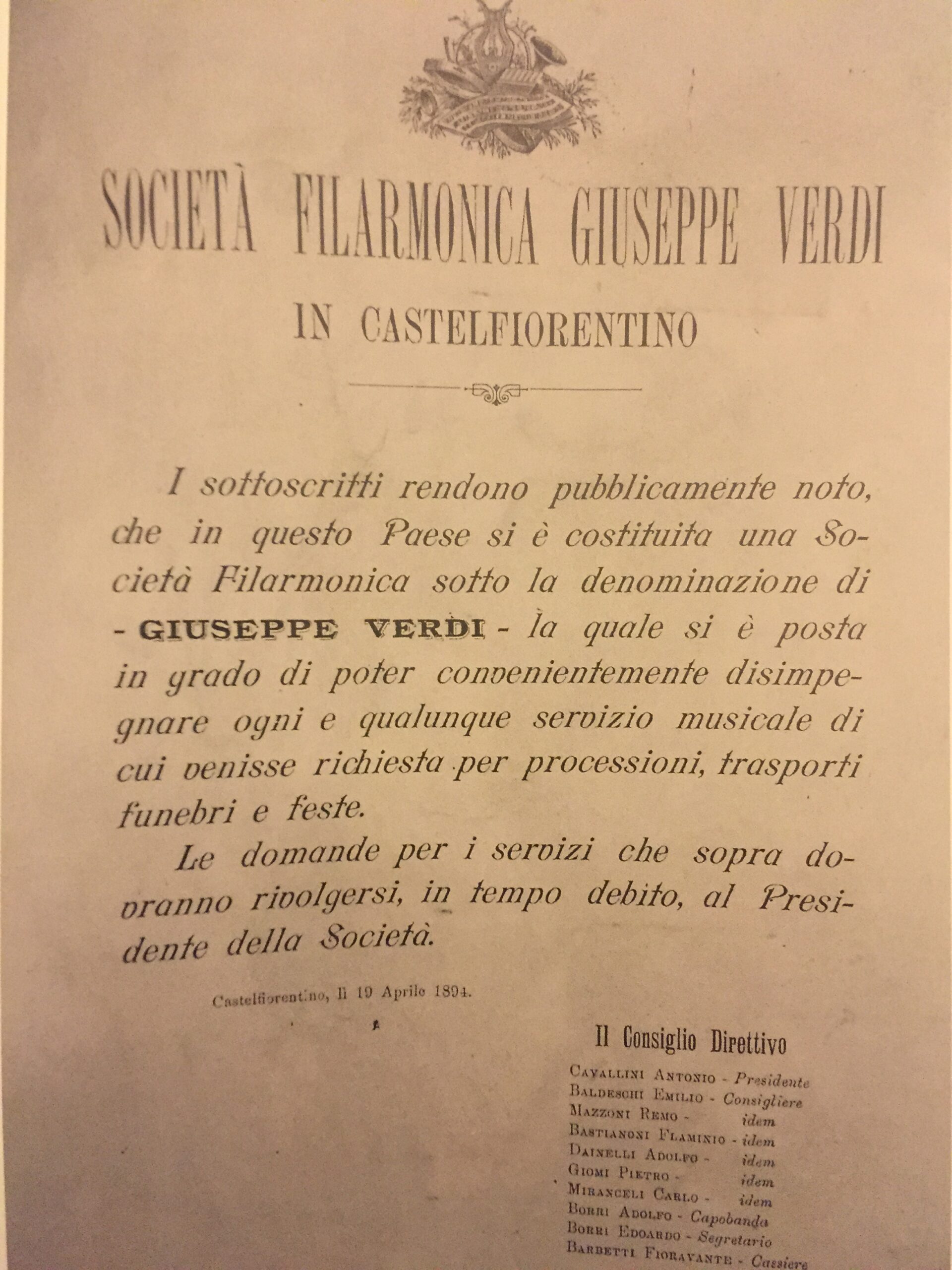Il 17 maggio 1822 quaranta cittadini di Castelfiorentino che si qualificavano “possidenti e abitanti di questa terra” inviarono una petizione al Comune perché formasse “una banda nel paese per istruzione della gioventù e decoro del medesimo”. A questo documento, che anticipa di due anni la costituzione “de facto” della “Banda” (di non è stato mai rintracciato l’atto costitutivo) viene fatta risalire l’origine della Filarmonica “Giuseppe Verdi” di Castelfiorentino, una storia di cultura e passione musicale “attraverso due secoli” di cui è autore Paolo Marini, e che sarà presentata sabato 13 gennaio (ore 17.00) al Ridotto del Teatro del Popolo di Castelfiorentino (ingresso libero).