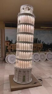 Per realizzare interamente all’uncinetto la Torre di Pisa, è servito un anno e mezzo di lavoro. La Torre, alta due metri e mezzo, è composta da 180 colonne ed altrettanti archi.