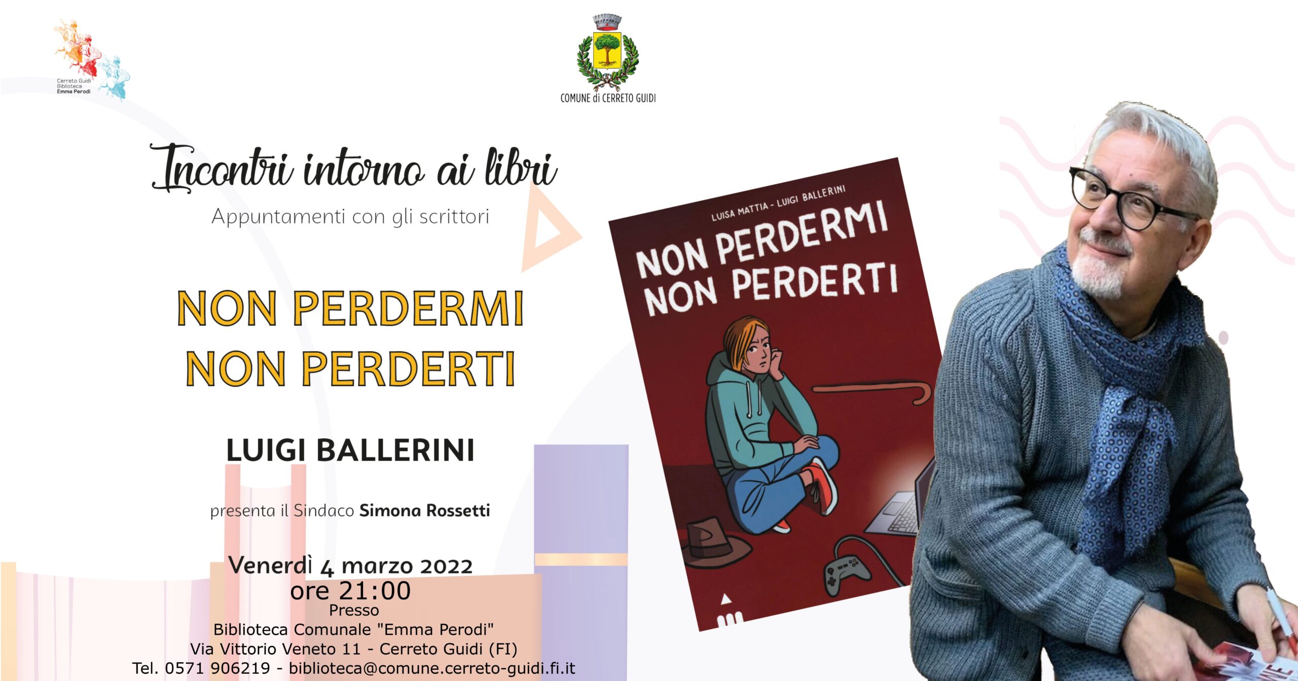 Cerreto Guidi, 28 febbraio 2022-Vanno avanti gli “Incontri intorno ai libri” ospitati nei locali della Biblioteca “Emma Perodi”. Il prossimo appuntamento è fissato per Venerdì 4 Marzo alle ore 21,00 con la presentazione del libro “Non perdermi, non perderti” (Edizione Lapis) di Luisa Mattia e Luigi Ballerini.