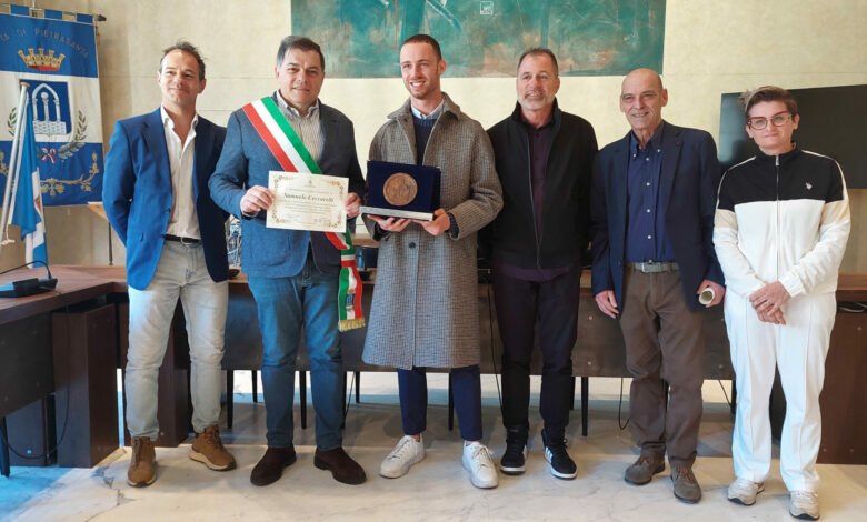 Con un tondo in bronzo, realizzato dalla fonderia Mariani e una pergamena di ringraziamento, l’amministrazione comunale di Pietrasanta ha voluto omaggiare il neo campione d’Europa indoor sui 60 metri, Samuele Ceccarelli e il suo allenatore, Marco Del Medico che da tre anni svolgono le sessioni di preparazione all’impianto sportivo “Falcone e Borsellino”.