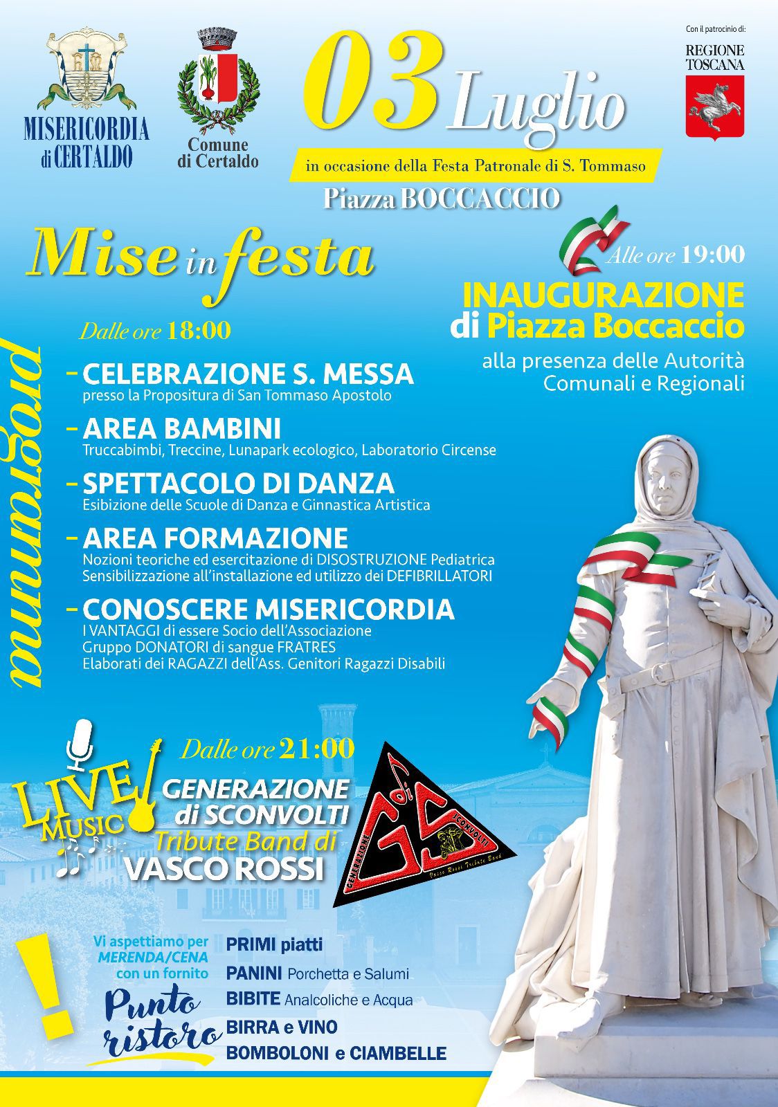 Certaldo, 20 giugno 2025 – Una giornata speciale per ritrovarsi, celebrare, scoprire e fare festa insieme. Mercoledì 3 luglio 2025, in occasione della Festa Patronale di San Tommaso, la Misericordia di Certaldo, con il patrocinio del Comune di Certaldo e della Regione Toscana, organizza “Mise in Festa”: un ricco programma di eventi in Piazza Boccaccio, cuore pulsante del centro cittadino.