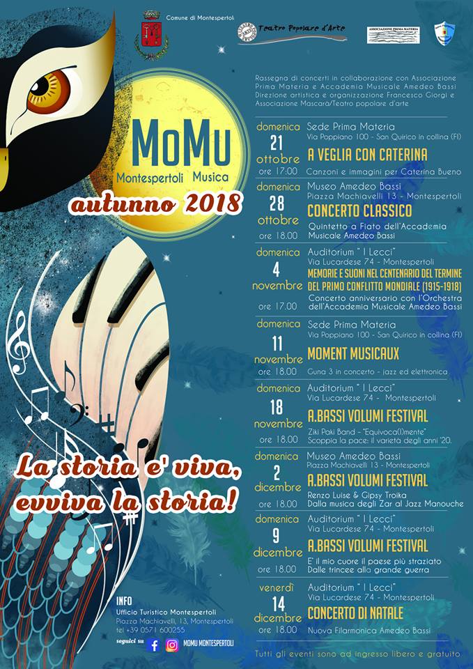 Confermatissimo, dopo le due precedenti edizioni, il festival “MoMu – Montespertoli Musica Autunno”, che comprende tre rassegne, per un appuntamento ogni settimana, a partire da domenica 21 ottobre, con il concerto dedicato alla cantante ed etnomusicologa Caterina Bueno realizzato dall’associazione Prima Materia, fino a venerdì 14 dicembre, con il consueto Concerto di Natale della Nuova Filarmonica Amedeo Bassi.