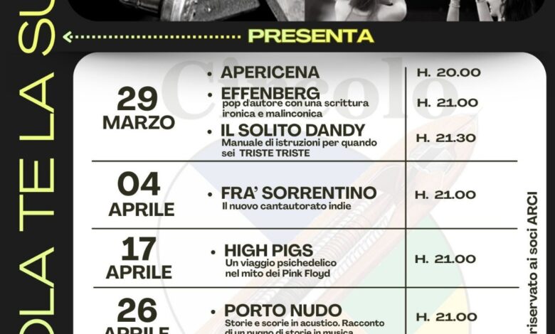 Il primo appuntamento è in programma domenica 29 marzo con una serata che si aprirà alle ore 20 con apericena, seguita alle 21 dal live di Effenberg, cantautore dal linguaggio ironico e malinconico, e alle 21.30 dallo spettacolo de Il Solito Dandy, “Manuale d’istruzioni per quando sei triste triste”, un progetto che unisce musica e racconto in una forma intima e contemporanea.