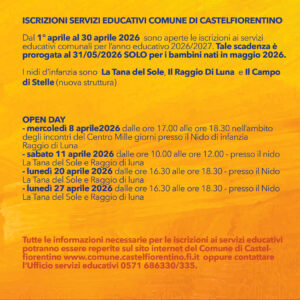 Servizi educativi e Nidi per la prima infanzia, da mercoledì 1 aprile sono aperte le iscrizioni per l’anno educativo 2026/2027. Grazie anche ai cospicui investimenti che sono stati realizzati di recente (avvalendosi anche dei fondi PNRR) il Comune di Castelfiorentino mette a disposizione tre strutture moderne, con ambienti luminosi e a misura di bambino, in grado di rispondere al meglio alle esigenze mutevoli delle famiglie.