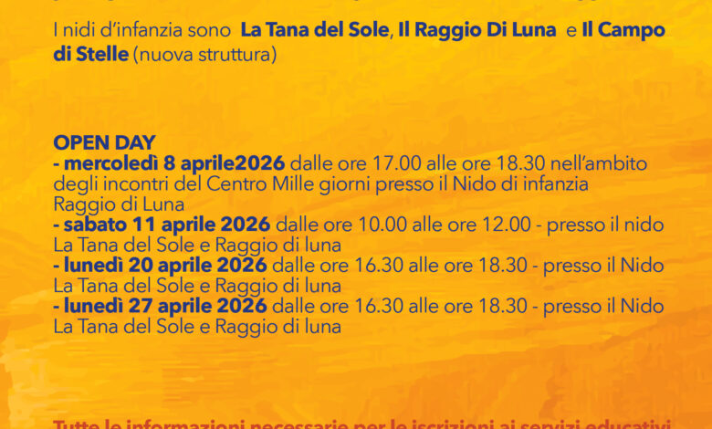 Allo scopo di far conoscere alle famiglie le varie strutture, sono state organizzate degli Open Day durante il mese di aprile: il primo appuntamento è in programma mercoledì 8 aprile (ore 17.00-18.30) presso il Nido d’infanzia “Raggio di Luna” nell’ambito degli incontri del Centro Mille giorni. A seguire altre tre date, che interessano sia il nido “La Tana del Sole” che il “Raggio di Luna”: – sabato 11 aprile (ore 10.00-12.00), lunedì 20 aprile (ore 16.30-18.30) e lunedì 27 aprile (ore 16.30-18.30)