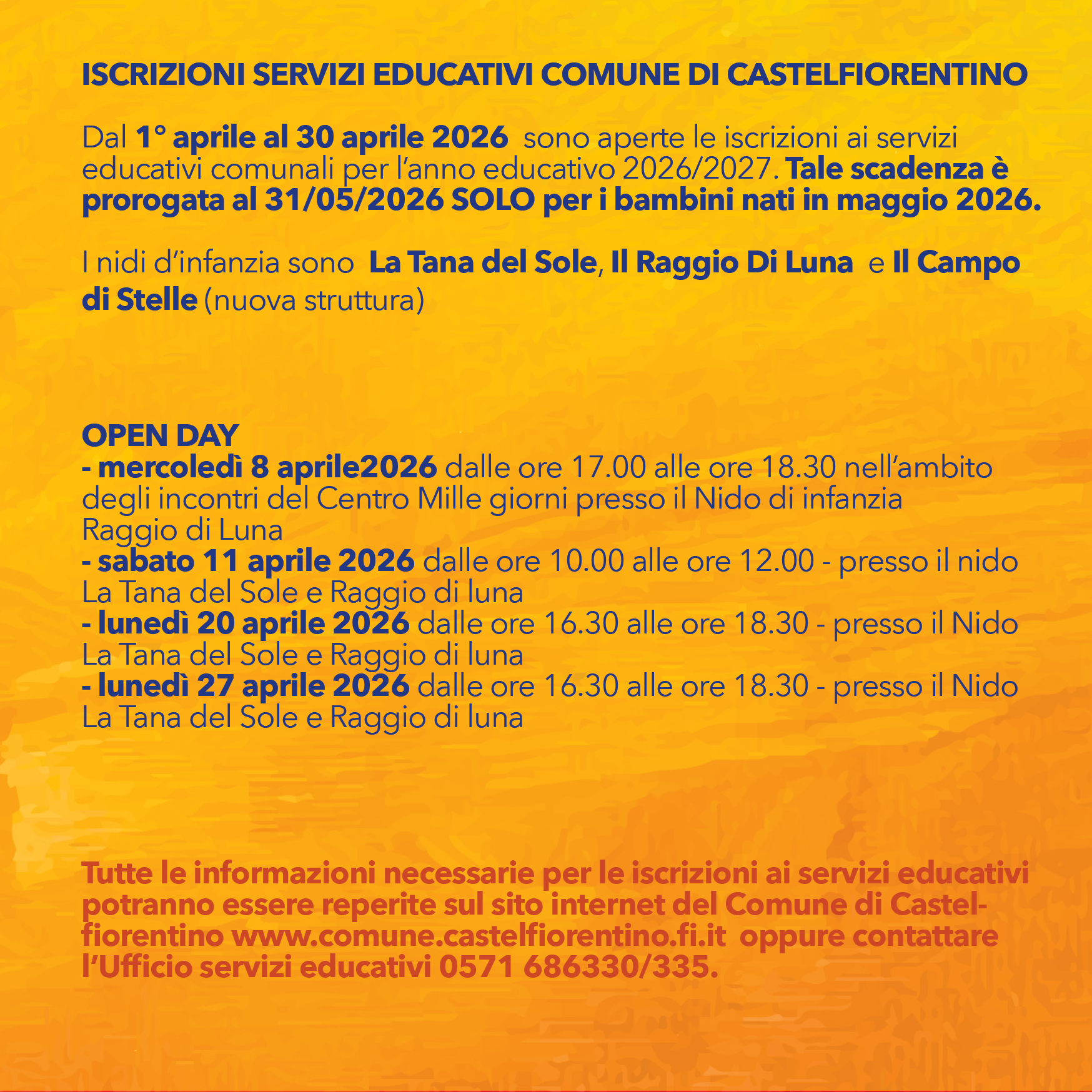 Le iscrizioni ai servizi educativi possono essere reperite sul sito internet del Comune di Castelfiorentino www.comune.castelfiorentino.fi.it oppure contattando l’Ufficio servizi educativi 0571 686330/335.