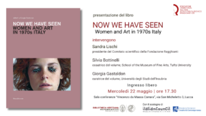 Mercoledì 22 maggio alle ore 17:30 la Fondazione Ragghianti di Lucca ospita la presentazione del libro “Now We Have Seen. Women and Art in 1970s Italy”. L’incontro, a ingresso libero, sarà introdotto e moderato da Sandra Lischi, presidente del Comitato scientifico della Fondazione Ragghianti. All’iniziativa interverranno la curatrice del volume, Giorgia Gastaldon, e Silvia Bottinelli, autrice di uno dei saggi contenuti nel libro, assieme a quelli di Maria Bremer, Lara Conte, Raffaella Perna e della stessa Gastaldon.