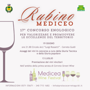 Cerreto Guidi, 17 giugno 2024– Non è mancata la risposta delle aziende alla selezione di vini “Rubino Mediceo” che, giunta alla 17°edizione, è promossa dall’Associazione Turistica Pro Loco e dal Comune di Cerreto Guidi.