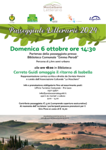 Il prossimo evento, una Passeggiata letteraria dedicata a Isabella de’Medici, si terrà Domenica 6 ottobre, con partenza alle ore 14.30 presso la Biblioteca comunale “Emma Perodi”. La passeggiata si articolerà lungo un percorso semi-urbano di circa 3Km.