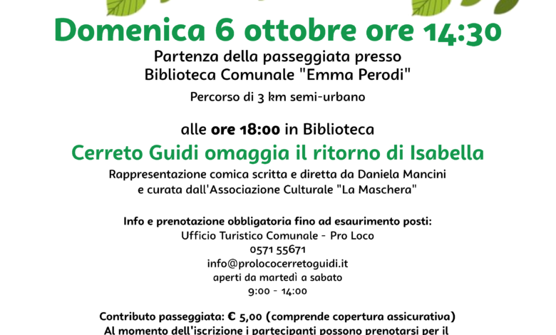 Cerreto Guidi, 2 ottobre 2024– Nel solco di una felice tradizione che le ha accolte ogni volta con grande entusiasmo, tornano a Cerreto Guidi, le Passeggiate letterarie. Se i temi individuati cambiano, non muta lo spirito dell’iniziativa che è un modo per proporre al visitatore una nuova chiave di lettura del territorio.