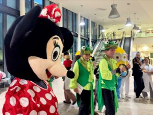 Personaggi dei cartoon, musica e Babbo Natale: lo spettacolo per i bambini della Pediatria nella hall dell’ospedale San Jacopo