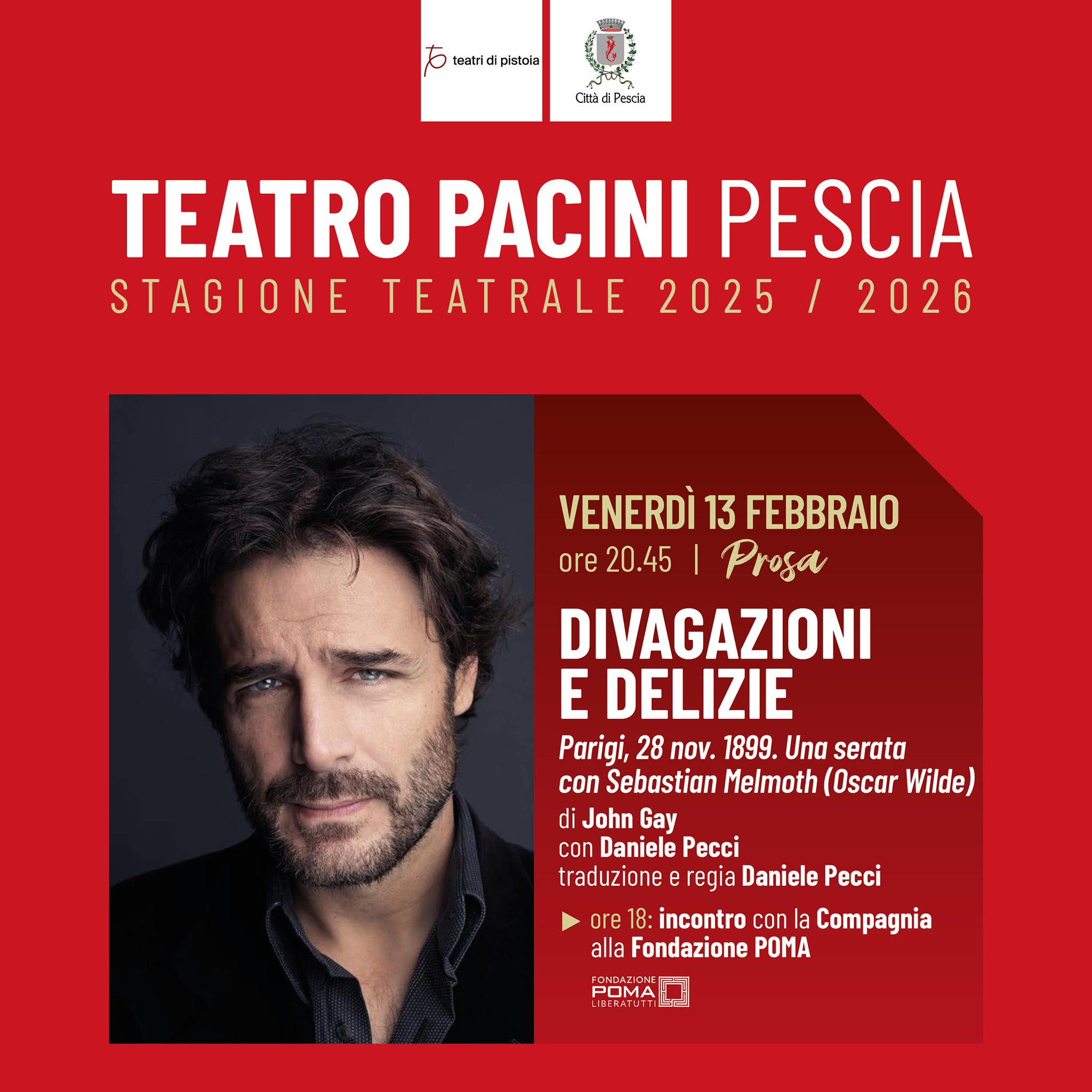 Protagonista del prossimo appuntamento della Stagione 2025/26 del Teatro Pacini di Pescia, promossa dall’Amministrazione comunale con Fondazione Teatri di Pistoia, è Daniele Pecci, popolare volto del teatro e cinema, in questi giorni anche sugli schermi TV con la fiction “Una nuova vita”. Pecci sarà in scena sul palco del Pacini venerdì 13 febbraio (ore 20.45) con DIVAGAZIONI E DELIZIE. PARIGI, 28 nov. 1899. Una serata con Sebastian Melmoth (Oscar Wilde) di John Gay, omaggio al grande scrittore e drammaturgo Oscar Wilde e dialogherà col pubblico nel corso dell’incontro alla Fondazione Poma alle ore 18 (ingresso libero fino ad esaurimento posti).