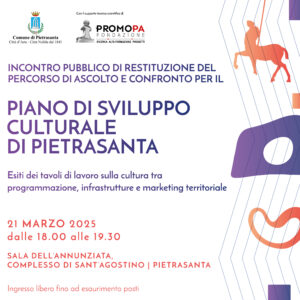 Concluso il percorso di ascolto e confronto dedicato alla realizzazione del piano strategico di sviluppo culturale di Pietrasanta, l’amministrazione comunale ha organizzato un ultimo incontro pubblico, venerdì 21 marzo a partire dalle 18, nel Salone dell’Annunziata, per “tirare le fila” di quanto emerso durante i tavoli di lavoro che hanno indagato il “tema cultura” tra programmazione, infrastrutture e marketing territoriale.
