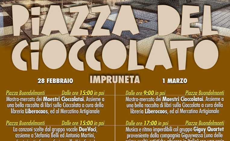 La Pro Loco di Impruneta, con il patrocinio del Comune di Impruneta, organizza la prima edizione della Piazza del Cioccolato, in programma dal 28 febbraio al 1 marzo 2026 in Piazza Buondelmonti e nel Loggiato del Pellegrino. L’iniziativa si inserisce nell’anno del Centenario della Festa dell’Uva e propone un percorso dedicato al cacao, alla sua storia e ai suoi legami con le tradizioni alimentari.