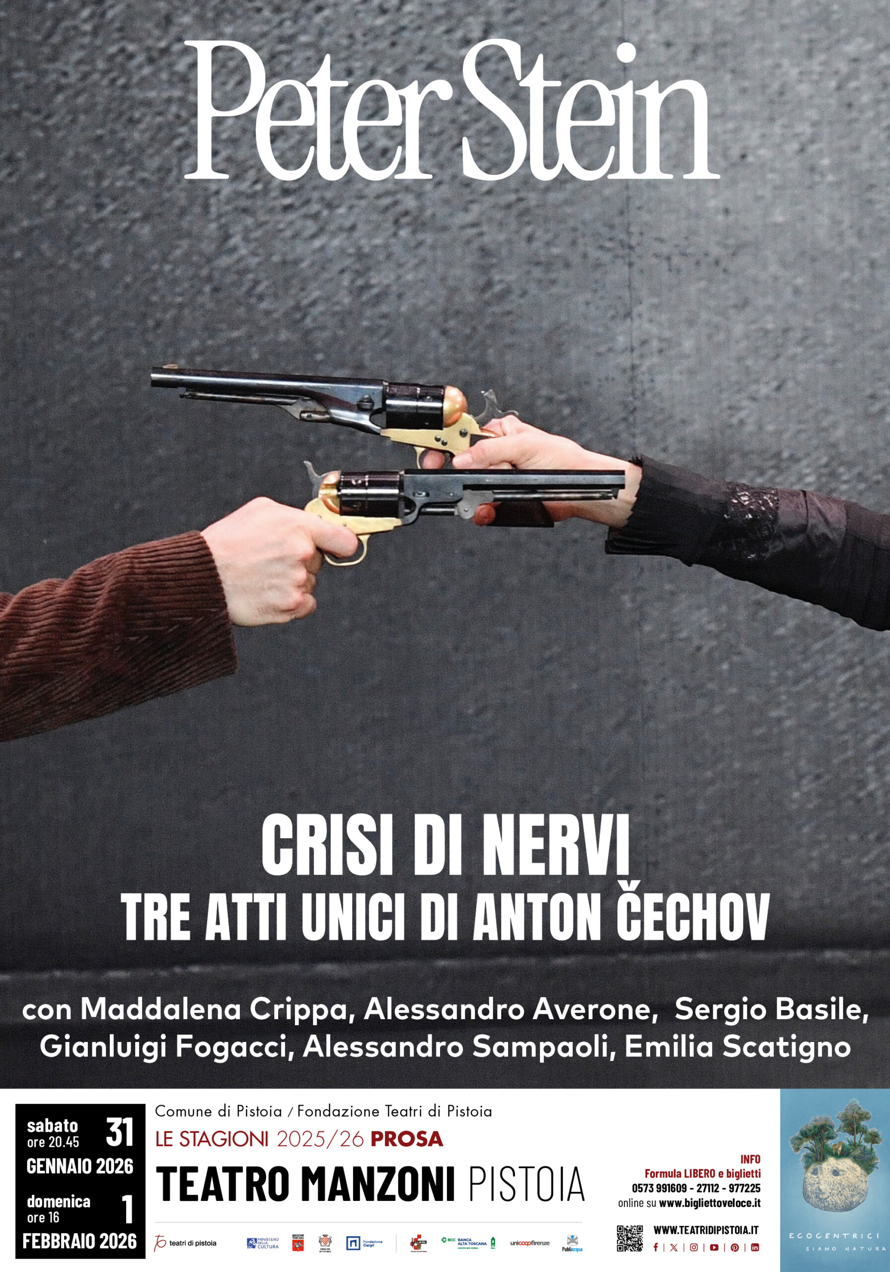 Al Teatro Manzoni di Pistoia per la Stagione di Prosa 2025/26 dei Teatri di Pistoia, curata da Saverio Barsanti, arriva CRISI DI NERVI, composto da tre atti unici di Anton Čechov, che porta la firma del grande regista tedesco Peter Stein, Premio Le Maschere del Teatro Italiano 2024 per la regia e Premio Internazionale Flaiano 2025 Miglior regia teatrale, prodotto da Tieffe Teatro Milano, in scena sabato 31 gennaio (ore 20.45) e domenica 1 febbraio (ore 16).