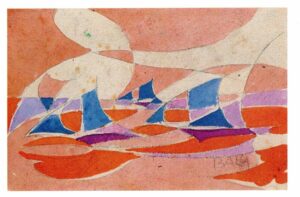 Il confronto diretto e inedito fra queste tre opere illumina una fase fondamentale della ricerca di Balla, maturata tra il 1919 e il 1925 tra Viareggio e Roma, una nuova stagione futurista in cui il tema del mare è interpretato attraverso linee di forza e cromie dinamiche. Onde, vele e riflessi marini non sono semplici motivi ornamentali, ma si trasformano in moduli astratti, elementi di un raffinato linguaggio decorativo moderno e sintetico in cui sono trasposti gli stati d’animo dell’artista di fronte ai fenomeni naturali.