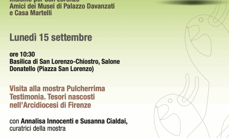 Al mattino (ore 10.30) si potrà visitare la mostra “Pulcherrima Testimonia. Tesori nascosti nell’Arcidiocesi di Firenze” accompagnati da Annalisa Innocenti e Susanna Cialdai, curatrici della mostra. L’iniziativa è cura di Amici dell’Opificio delle Pietre Dure, Insieme per San Lorenzo, Amici dei Musei di Palazzo Davanzati e Casa Martelli (prenotazione obbligatoria: annalisa.innocenti@amiciopificio.org; massimo 25 persone).