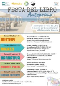 La rassegna al Palazzo della Spiaggia comprende cinque incontri per altrettanti generi letterari, ogni sabato alle 19 dal 12 luglio al 9 agosto, e non solo: ogni presentazione sarà anche occasione per incontrare non solo gli autori dei volumi presentati ma anche gli organizzatori della Festa del libro, le case editrici, per raccontare il dietro del quinte degli eventi letterari e della faticosa gestazione che c’è dietro ogni volume pubblicato, ma anche per scoprire nuovo progetti e idee che hanno al centro il libro e le sue molte vite. Conduce Adele Marra.