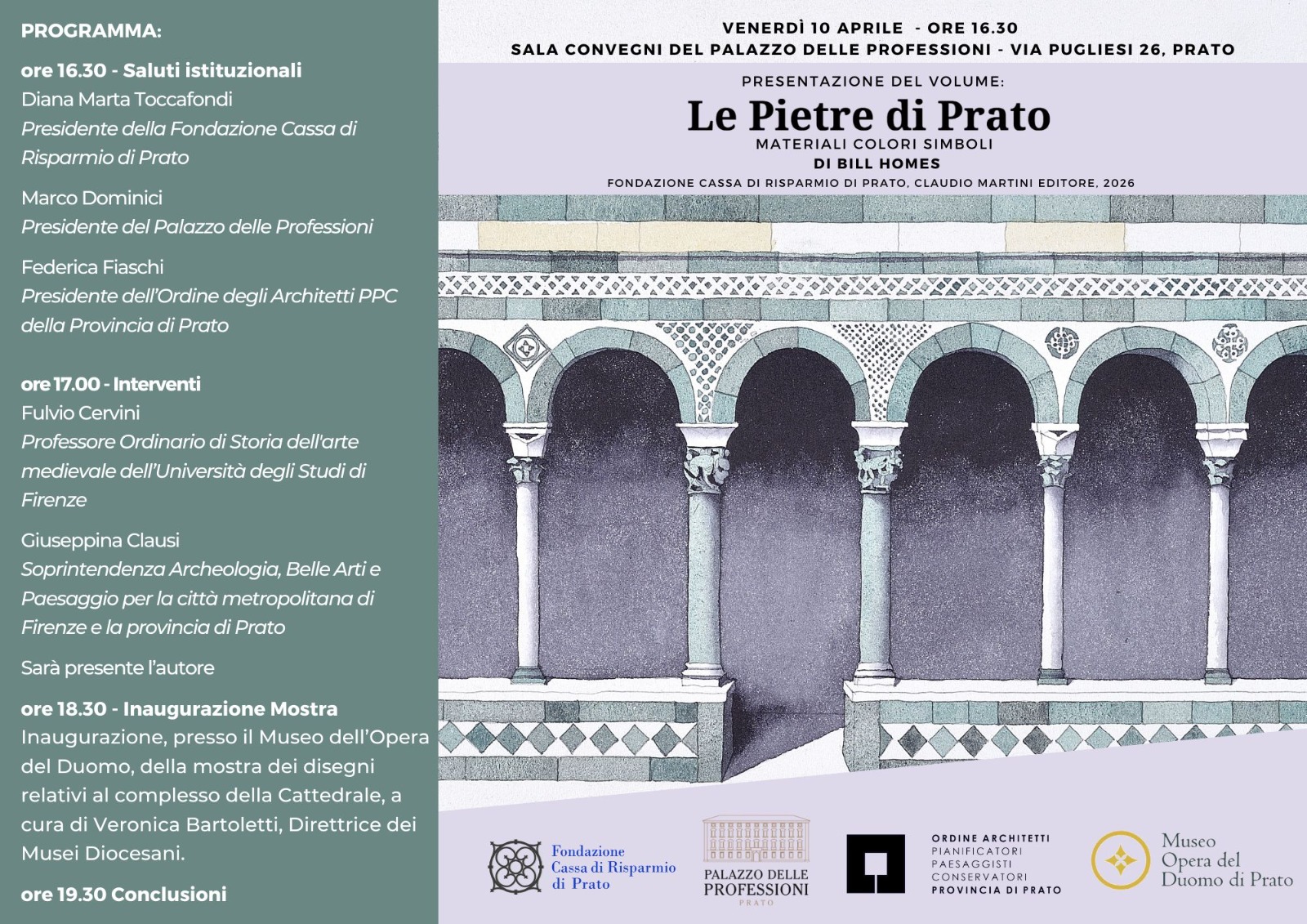 Le pietre di Prato verranno presentate al pubblico venerdì 10 aprile, alle 16.30 nella sala convegni del Palazzo delle Professioni. Con l’autore e la presidente Toccafondi intervengono il presidente del Palazzo delle Professioni, Marco Dominici; la presidente dell’Ordine degli Architetti, Federica Fiaschi; il professor Fulvio Cervini, docente di Storia dell’arte medievale all’Università di Firenze e l’arch. Giuseppina Clausi, funzionaria della Soprintendenza Archeologica, Belle arti e Paesaggio. Una selezione di tavole, che sono parte del volume, verrà esposta per l’occasione al Palazzo delle Professioni.
