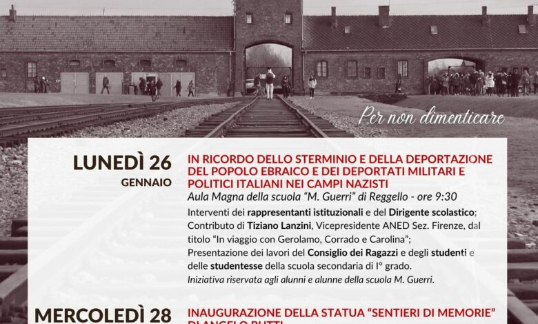 Il primo appuntamento è in programma lunedì 26 gennaio, alle ore 9.30, presso l’Aula Magna della scuola “M. Guerri” di Reggello, con un’iniziativa riservata agli alunni e alle alunne dell’istituto. Dopo i saluti dei rappresentanti istituzionali e del Dirigente scolastico, è previsto il contributo di Tiziano Lanzini, vicepresidente ANED – sezione di Firenze, dal titolo “In viaggio con Gerolamo, Corrado e Carolina”, seguito dalla presentazione dei lavori realizzati dal Consiglio dei Ragazzi e dagli studenti e dalle studentesse della scuola secondaria di primo grado.