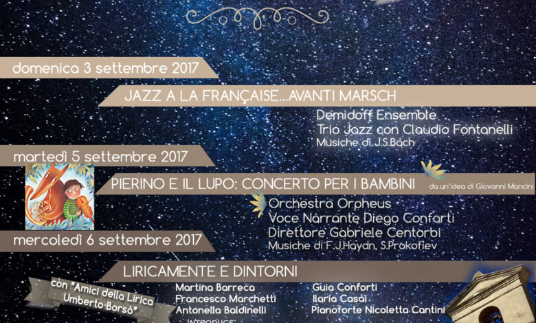 Martedì 5 settembre un evento imperdibile per i bambini: il concerto dell’Orchestra Orpheus “Pierino e il lupo”, diretto dal maestro Gabriele Centorbi da un’idea di Giovanni Mancini. Ci sarà modo di ascoltare anche la “Sinfonia dei giocattoli” di Haydn con la partecipazione dei ragazzi della scuola di musica, mentre la voce narrante sarà di Diego Conforti.