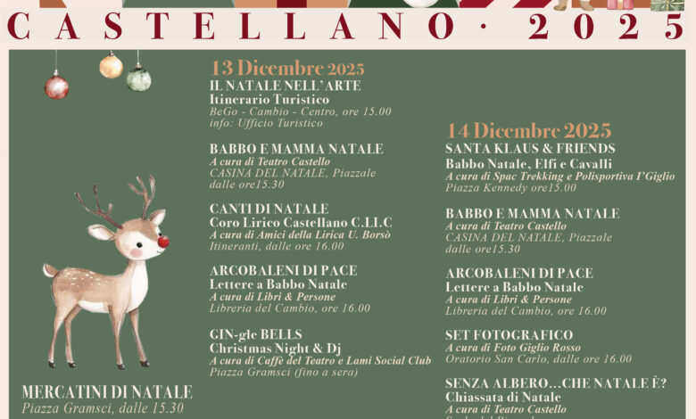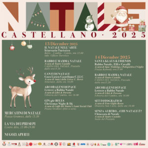 Tra sabato 13 e domenica 14 dicembre oltre dieci eventi tra i Canti di Natale del Coro Lirico Castellano, le Lettere a Babbo Natale, il set fotografico all’Oratorio di San Carlo, la Casina di Babbo Natale con TeatroCastello, un itinerario turistico (Natale nell’arte) un Babbo Natale “tra Elfi e Cavalli”, i “Babbi Natale” in bici del “La Rotonda” e le “chiassate” natalizie. Mercoledì 17 appuntamento con “Christmas Gospel” alla Chiesa di Santa Maria della Marca. Sabato 20 laboratorio natalizio alla “casina del Natale”, le “Cornamuse itineranti” e lo spettacolo “Lo schiaccianoci” al Teatro del Popolo, mentre domenica 21 oltre ad alcuni eventi già presenti la domenica precedente ci saranno anche il “Lancio del Panforte” e un saggio della scuola di musica. E non è finita perché il programma delle feste natalizie riprenderà il 27 dicembre con un concerto degli Amici della Lirica e tanti altri eventi fino all’Epifania.