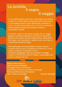 “Con La scintilla. Il sogno. Il viaggio. la nostra Associazione – dice Daniele Marseglia, presidente di Rosebud APS – intende celebrare l’opera e l’eredità di tre figure imprescindibili della storia del cinema: Alice Guy, Maya Deren e Agnès Varda. Donne che, con il loro talento e la loro determinazione, hanno saputo imprimere una svolta decisiva al linguaggio cinematografico. Questo spettacolo rappresenta un omaggio doveroso, ma anche un atto di riconoscenza nei confronti di artiste che hanno saputo trasformare la loro visione in patrimonio universale, anticipando e aprendo percorsi che ancora oggi ispirano generazioni di autori e spettatori.”