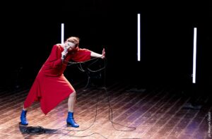 Sul palco l’attrice e regista Luisa Borini con un microfono a farle da scudo per parlare di dipendenza affettiva, dolore, cicatrici, cadute e, finalmente, rinascite