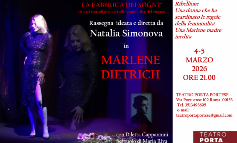 Dopo il grande successo ottenuto con Greta Garbo, Natalia Simonova torna sul palco del Teatro Porta Portese con Marlene Dietrich, nuovo appuntamento della rassegna teatrale Hollywood – La Fabbrica dei Sogni, progetto di ampio respiro da lei ideato, diretto e interpretato.