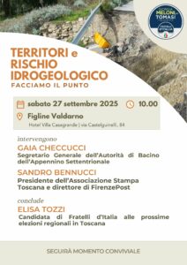 Sabato 27 settembre 2025, alle 10  presso l’Hotel Villa Casagrande (via Castelguinelli, 84 – Figline Valdarno), si terrà l’incontro pubblico “Territori e rischio idrogeologico: facciamo il punto”, promosso da Fratelli d’Italia.