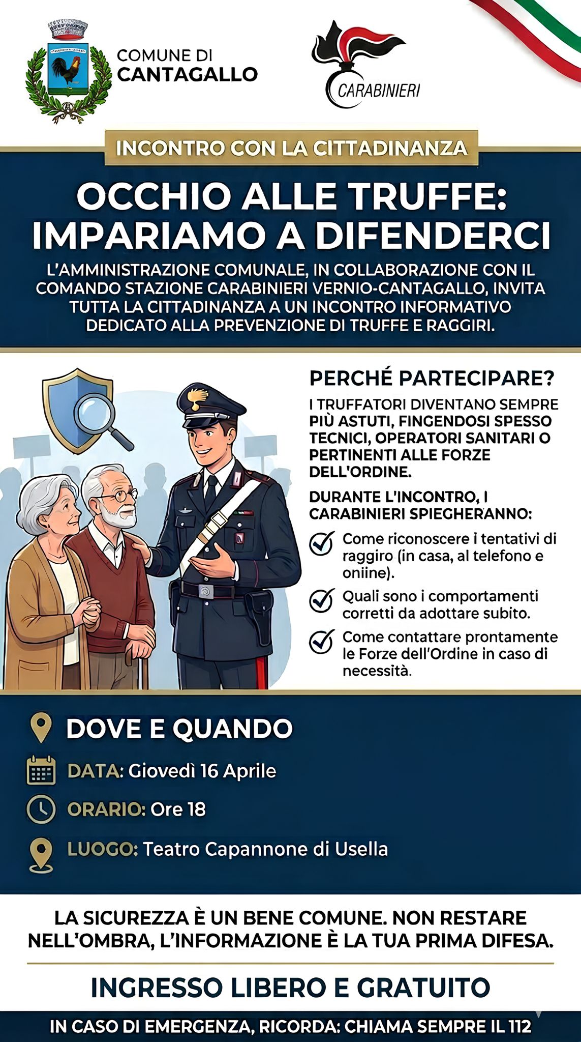 L’appuntamento è fissato per giovedì 16 aprile alle ore 18 nel Teatro Capannone di Usella e rappresenta un’occasione concreta per acquisire strumenti utili a riconoscere e prevenire le truffe, che oggi si presentano con modalità sempre più sofisticate: dalle telefonate ingannevoli, in cui i truffatori si fingono parenti o appartenenti alle forze dell’ordine, ai falsi operatori porta a porta, fino alle truffe online.
