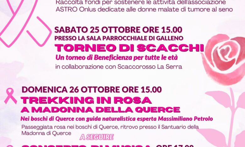 Infine, domenica 26 ottobre, la giornata sarà dedicata al movimento e alla musica. Alle 15 partirà il Trekking in Rosa nei boschi di Querce, accompagnato dalla guida naturalistica Massimiliano Petrolo, con ritrovo presso il Santuario della Madonna di Querce.