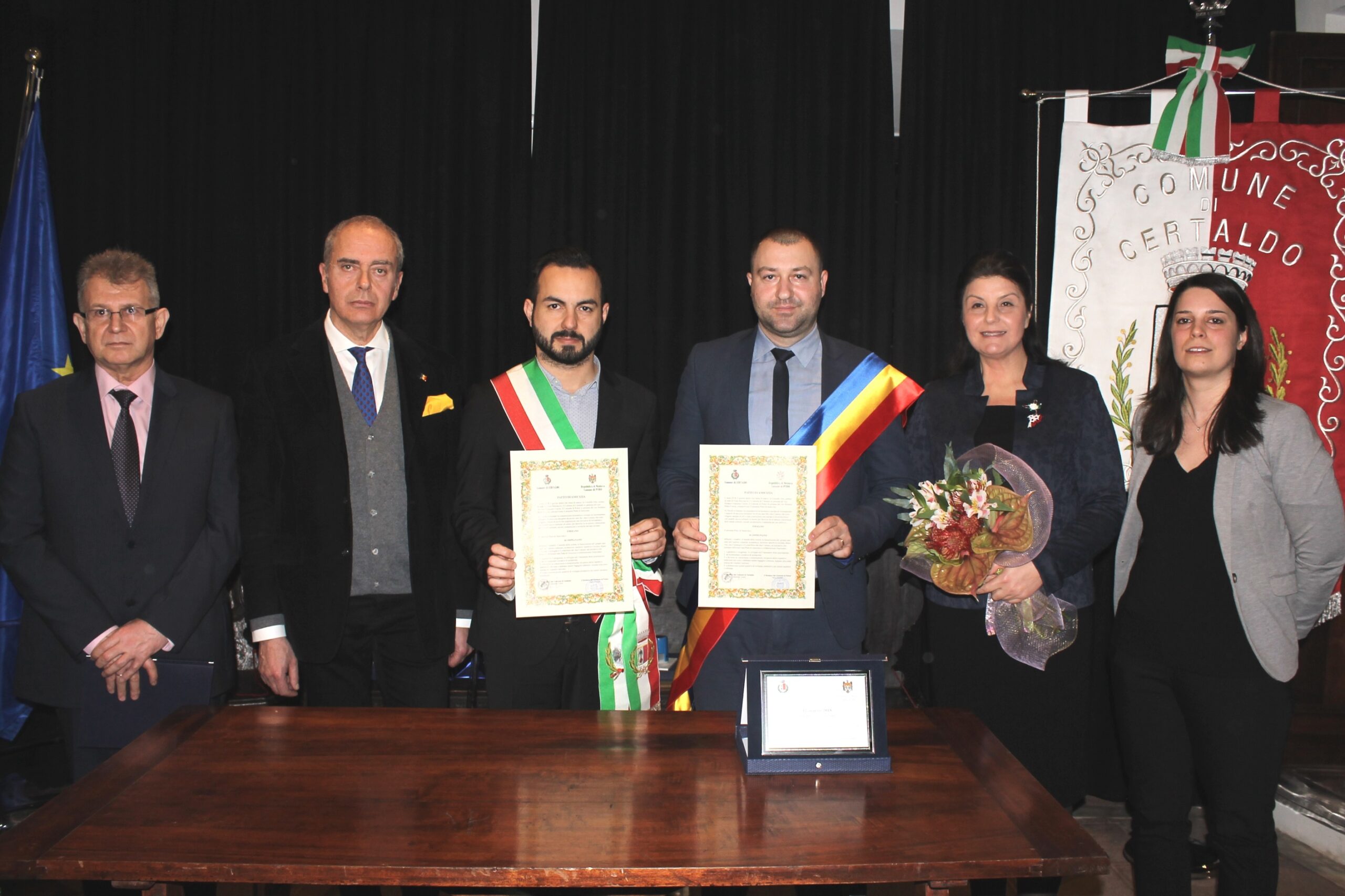 L’Italia e la Moldova sono ora più vicine. E’ stato siglato ieri sera, il dodici marzo 2018, nella Casa di Boccaccio in Certaldo Alto, il “patto di amicizia” tra il Comune di Certaldo – rappresentato dal Sindaco Giacomo Cucini – ed il Comune di Puhoi – rappresentato dal Sindaco Petru Frunze. Con loro, i cittadini ed i volontari delle associazioni Croce Rossa, Elitropia, Misericordia, Prociv Arci. E poi le autorità locali e moldave: Clara Conforti, Assessore ai gemellaggi del Comune di Certaldo, il neo console onorario della Repubblica di Moldova in Firenze, Alessandro Signorini, certaldese e Tatiana Nogalic, della AssoMoldave in Italia, Lido Orsi dell’Associazione per gli scambi interculturali, persone che si sono adoperate per costruire, in questi anni, il ponte tra le due cittadine. E poi Sergiu Goncearenco, Console generale della Repubblica di Moldova e Sua Eccellenza l’ambasciatrice della Repubblica di Moldova in Italia, Stela Stingaci. Oltre ad una nutrita delegazione del comune moldavo.