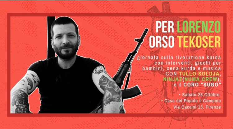 Il 26 ottobre 2019 sarà una giornata dedicata alla figura di Lorenzo Orsetti, alle vicissitudini nella Siria del Nord e le sofferenze del popolo curdo. L’occasione permette di approfondire la realtà del Rojava nelle condizioni attuali e comprendere quali forze e interessi costringono un popolo a finire massacrato da una guerra dilaniante. Dalle ore 15.30 al Circolo Arci Le Panche, Il Campino, in via Caccini 13/B saranno organizzati giochi, racconti, e merenda, per tutti i bambini con Annalisa e Alessandro Orsetti. Rappresenta un modo per ricordare Orso e la sua battaglia in difesa di un ideale universale di pace, capire la sua storia, la sua vita e i suoi valori.