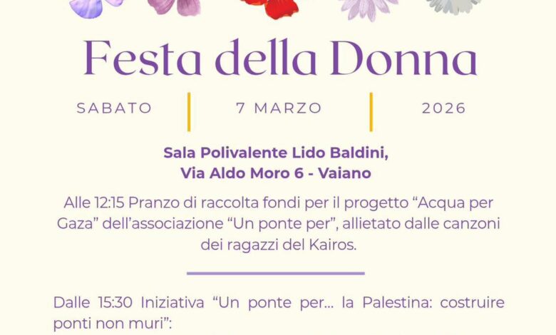 La prima iniziativa, in programma sabato 7 marzo alla Sala Polivalente Lido Baldini, unisce solidarietà internazionale e consapevolezza critica. Alle 12.15 si terrà un pranzo di raccolta fondi a sostegno del progetto “Acqua per Gaza”, mentre alle 15.30 l’iniziativa “Un ponte per… la Palestina: costruire ponti non muri” proporrà la proiezione del film Il giardino dei limoni, seguita da un dibattito con cooperanti ed esperti, tra cui Bianca Farsetti e Sharif Hamad. Un momento di approfondimento per riflettere sulla complessità dei conflitti in corso e sul ruolo delle donne nei contesti di guerra e occupazione.