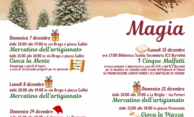 Domenica 7 dicembre via Braga e piazza Galilei ospiteranno, dalle 10 alle 19, il mercatino dell’artigianato. Nel pomeriggio, dalle 15 alle 18, sarà protagonista La merenda di Natale, a cura del gruppo scout Agesci 1 Vaiano, accompagnata dall’iniziativa “Gioca la mente”, con rompicapo e giochi di logica a cura di Terzostudio progetti per lo spettacolo. Sempre nella giornata di domenica sarà aperto il mercatino del ricamo a cura della Caritas, visitabile al Chiostro della Badia dalle 8 alle 12 e dalle 16 alle 18.30.