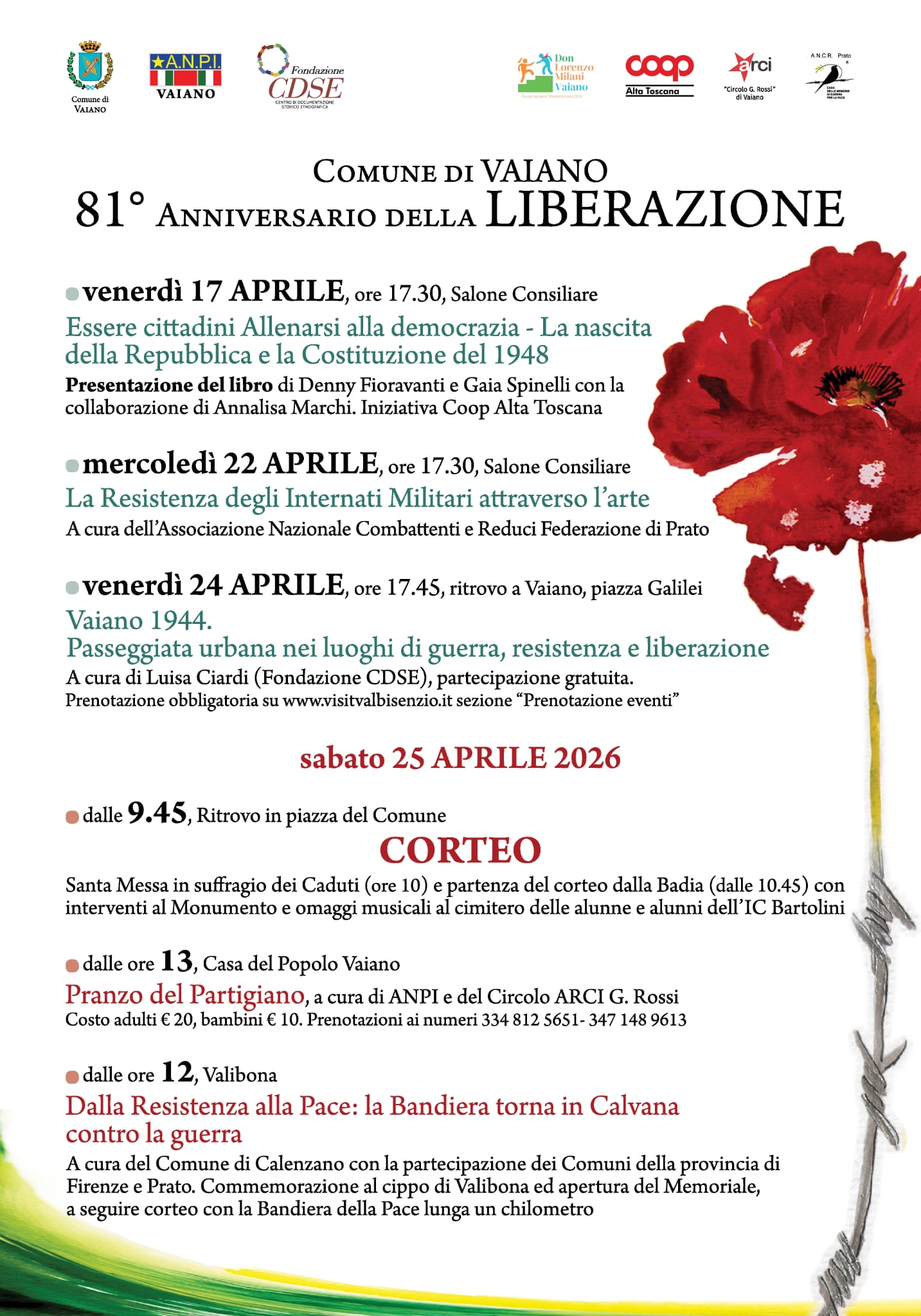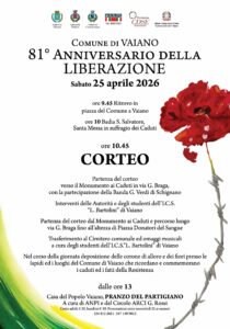 Vaiano, 15 aprile 2026 – Il Comune di Vaiano presenta le iniziative per l’81° anniversario della Liberazione, con appuntamenti distribuiti su più giornate e pensati per coinvolgere tutta la cittadinanza, a partire dai più giovani.