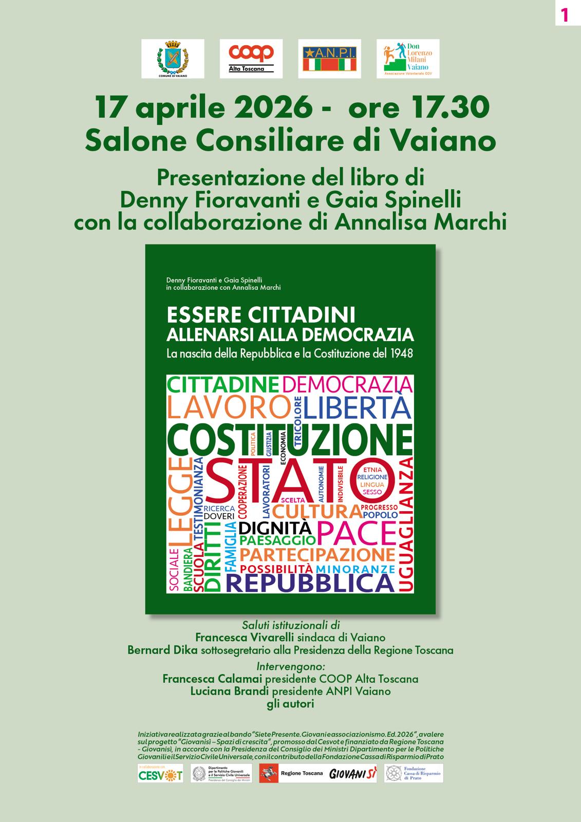 Questa è la novità più rilevante che accompagna la presentazione del libro “Essere cittadini, allenarsi alla democrazia. La nascita della Repubblica e la Costituzione del 1948” prevista per venerdì 17 aprile alle 17.30 presso il salone consiliare del Comune di Vaiano, evento che apre il cartellone delle celebrazioni del 25 aprile a Vaiano e che vedrà la partecipazione di Bernard Dika, sottosegretario alla Presidenza della Regione Toscana.