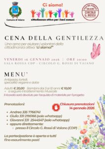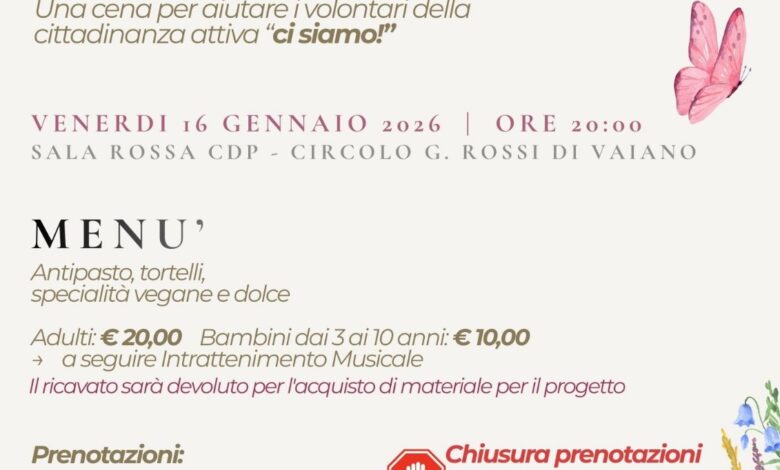 Vaiano, 10 gennaio 2025 – Venerdì 16 gennaio 2026, alle ore 20, nella Sala Rossa della Casa del Popolo – Circolo G. Rossi di Vaiano, si terrà la Cena della Gentilezza, un’iniziativa solidale e conviviale dedicata al valore della partecipazione, della cura del territorio e della comunità.