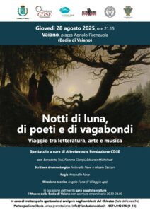 Vaiano, 25 agosto 2025 – Prosegue l’estate culturale vaianese con un nuovo appuntamento che unisce letteratura, musica e arte. Giovedì 28 agosto, alle ore 21.15, in piazza Agnolo Firenzuola (Badia di San Salvatore a Vaiano), andrà in scena lo spettacolo “Notti di luna, di poeti e di vagabondi. Viaggio tra letteratura, arte e musica”, a cura di Altroteatro e Fondazione Cdse.